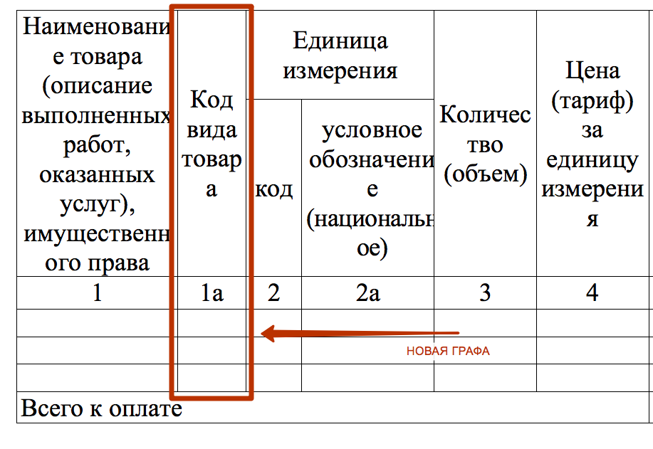 С 1 октября 2017 года в форме счета-фактура появилась новая графа 1а «Кода вида товара». Ее нужно заполнять организациям, вывозящим товары за пределы РФ в страны ЕАЭС. Код вида товара нужно будет указывать в соответствии с единой Товарной номенклатурой внешнеэкономической деятельности ЕАЭС.