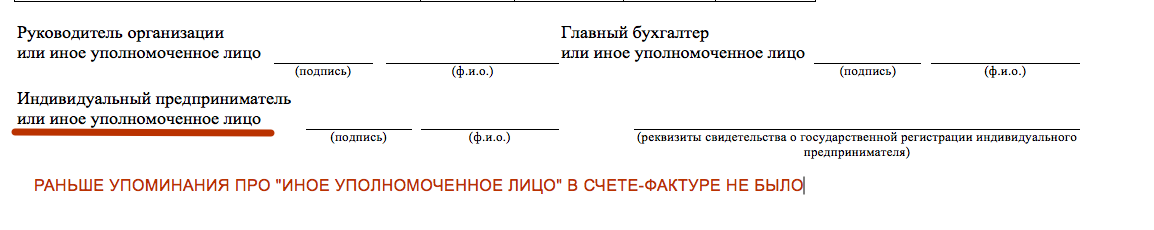 С 1 октября 2017 года в бланке счета-фактуры появилась новая графа для подписи уполномоченного лица, подписывающего счет-фактуру за предпринимателя. Раньше такие графы были в счете-фактуре исключительно для подписей лиц, которые расписываются за руководителя или главного бухгалтера.