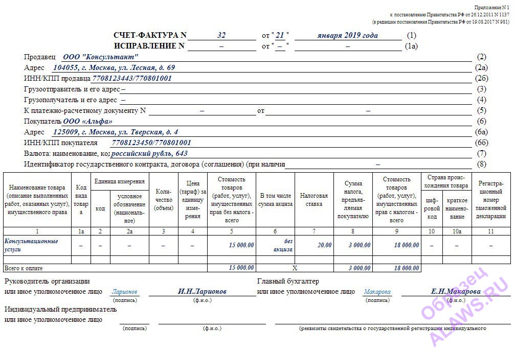 Образец заполнения счета-фактуры с 01.10.2017 —