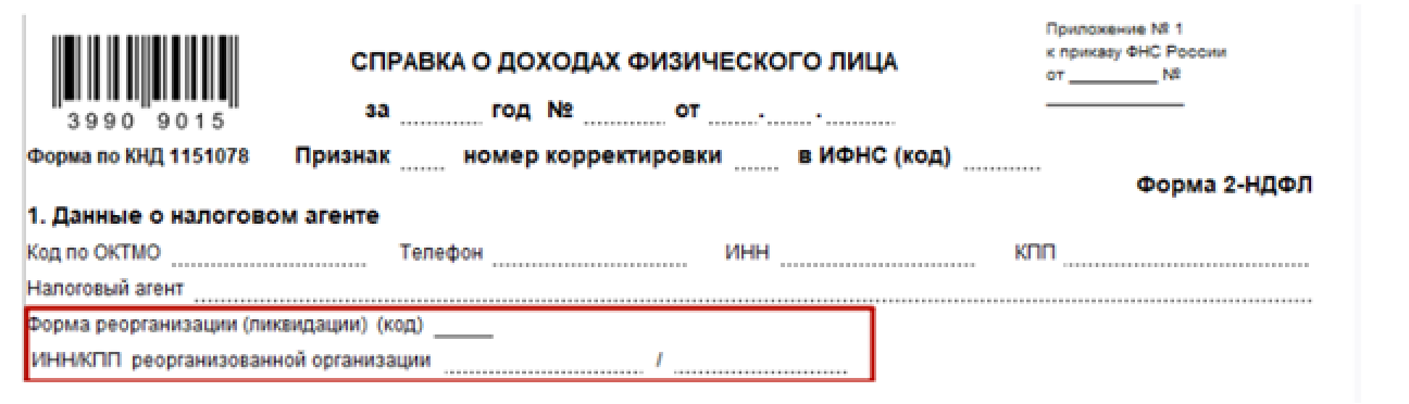 Для того, чтобы преемник имел возможность предоставлять отчетность в Раздел 1 формы 2-НФДЛ, добавили новые поля: «Форма реорганизации (ликвидации)» и «ИНН/КПП реорганизованной организации».