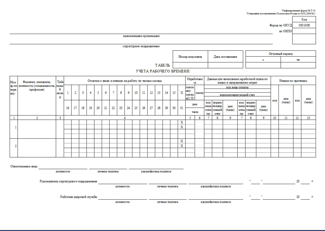 Итак, рабочее время каждого работника необходимо учитывать. Для этого Постановлением Госкомстата РФ от 05.01.2004 N 1 «Об утверждении унифицированных форм первичной учетной документации по учету труда и его оплаты» утверждены формы табеля учета рабочего времени — Т-12 и Т-13. Эти формы применяются для учета времени, фактически отработанного и (или) не отработанного каждым работником организации, контроля за соблюдением установленного режима рабочего времени, получения данных об отработанном времени для расчета оплаты труда и составления статистической отчетности по труду.