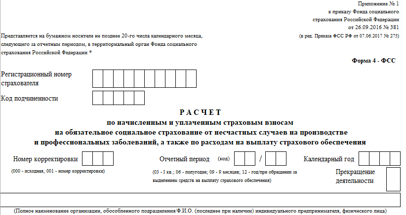 Согласно требованиям Фонда соцстраха, расчет базы для начисления страховых взносов от производственных несчастий и профзаболеваний отражают в Таблице 1 отчета 4-ФСС. Его бланк утвержден приказом от 26 сентября 2016 года № 381 (Приложение № 1). Этим же распоряжением ФСС закреплён порядок заполнения данной формы.