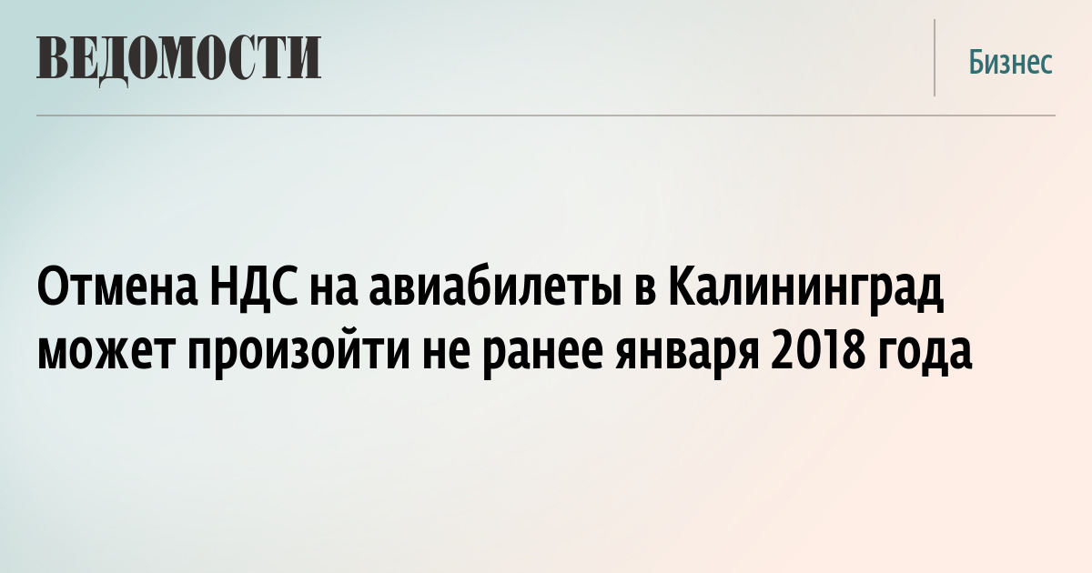 Президент Владимир Путин в среду поручил отменить НДС на авиаперевозки для Калининграда, несмотря на возражения Минфина. Это должно привести к снижению цен на авиабилеты в этом направлении на 10%, что, по мнению президента, станет хорошей новостью для жителей региона, в котором в сентябре пройдут выборы губернатора.