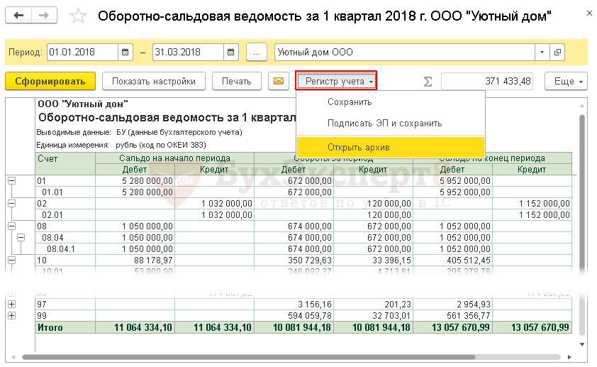 Чтобы открыть уже сохраненные отчеты ОСВ в электронном архиве нажмите кнопку Регистр учета — Открыть архив.