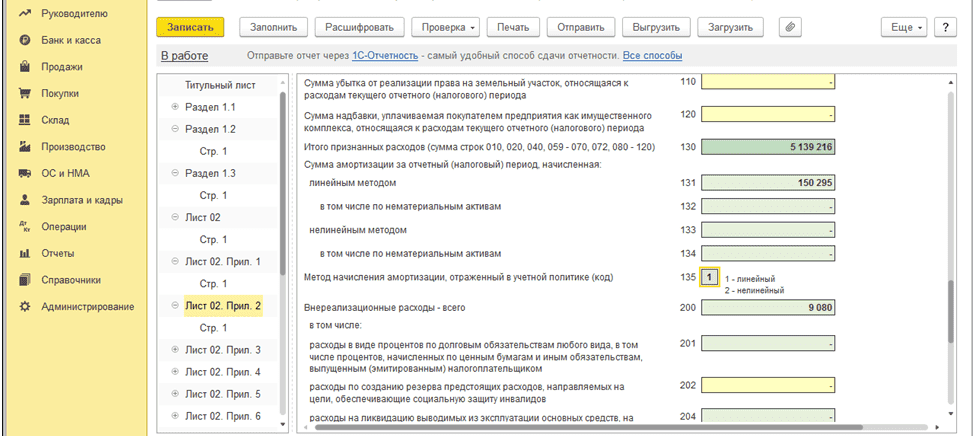Сумма начисленного износа отражается в декларации по прибыли организаций. Для этого в отчете предусмотрены строки 131-134 приложения 2 листа 02. Кроме того бухгалтер обязан сделать отметку о том, какой метод амортизации применяется организацией.