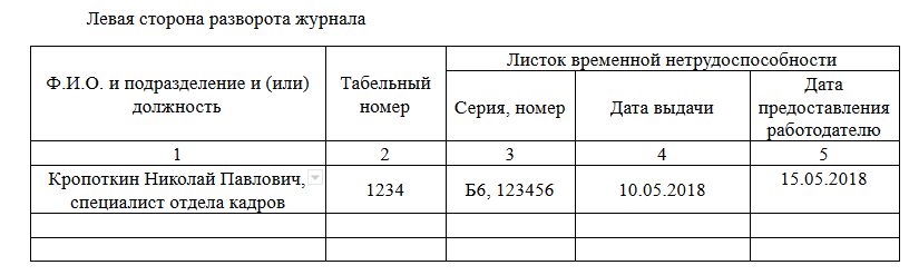 Стандартная схема журнала регистрации больничных листов выглядит следующим образом: