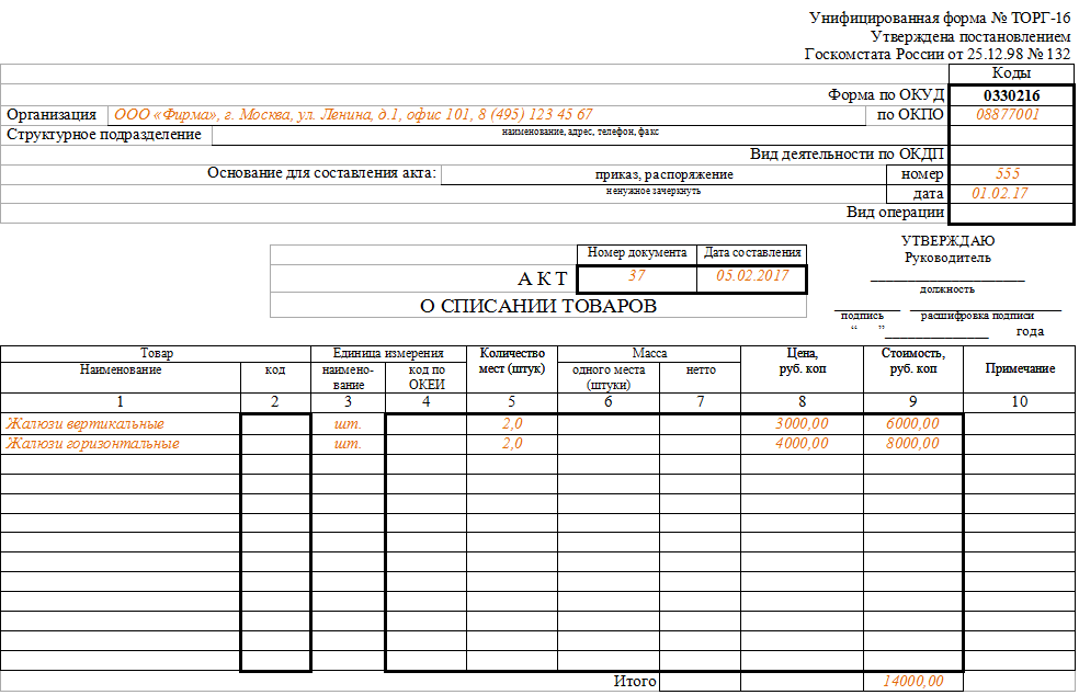 «Списать офисную мебель согласно Приложению 1 к акту в связи с истечением срока службы, установленного производителем указанной мебели ООО «Офисная мебель» в техническом паспорте (Приложение 2), как представляющую потенциальную опасность для здоровья сотрудников, имущества организации и окружающей среды согласно нормам Постановления Правительства РФ от 16.06.1997 № 720″.