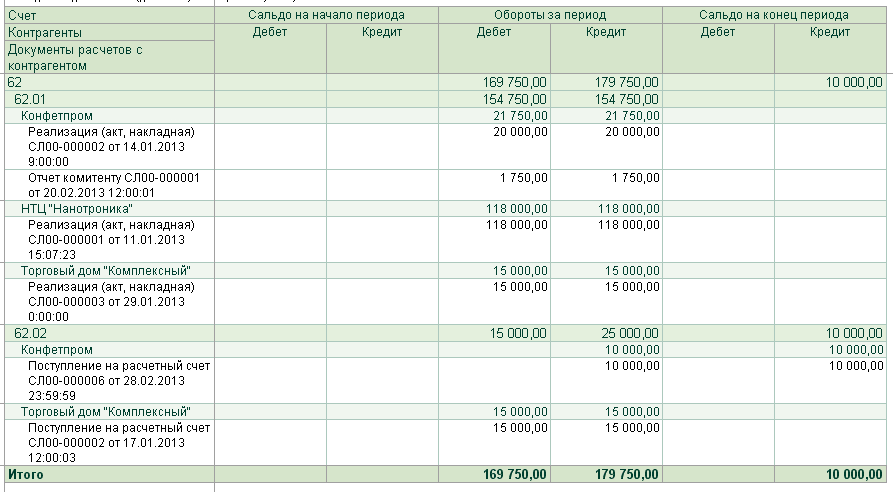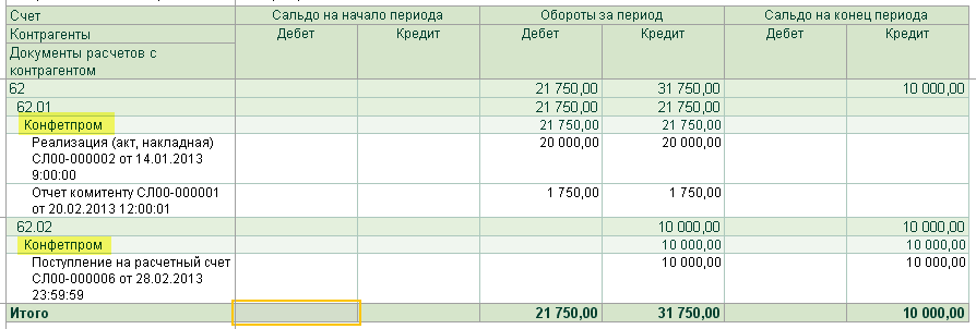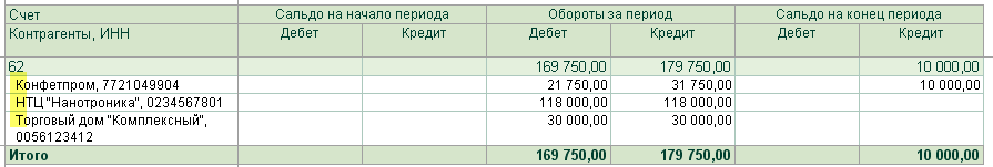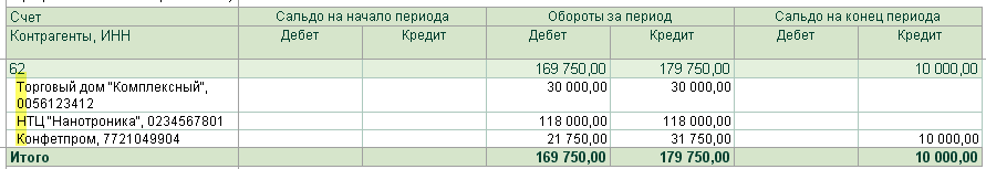 Из отчёта мы видим, что с покупателями Нанотроника и Торговый дом Комплексный мы рассчитались полностью, а вот по Конфетпрому у нас висит аванс в 10 000 рублей.