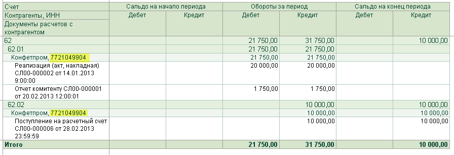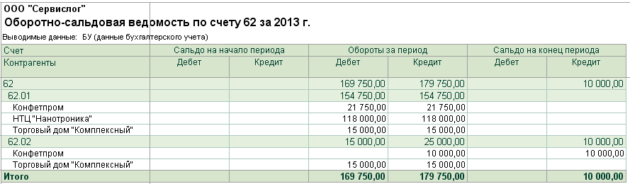 После этого нажмём кнопку «Сформировать» и увидим, что 10 000 действительно зависли на 62.02 (авансы полученные от покупателей):