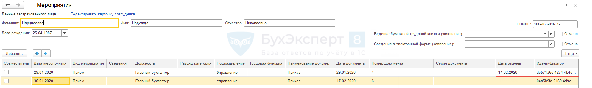 При указании Даты отмены в строке с отменяемым событием автоматически заполнится поле Идентификатор: