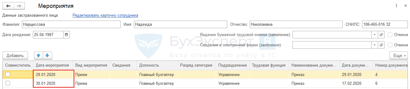 Для подачи корректировки следует создать новый отчет, подобрать в него сотрудника, внести вручную строки с мероприятиями. Например, для корректировки ранее переданных сведений, когда ошиблись в дате приема сотрудника и вместо 30.01.2020 указали 29.01.2020 г., необходимо внести две строки: одну с отменяемыми сведениями, вторую – с новыми корректными сведениями: