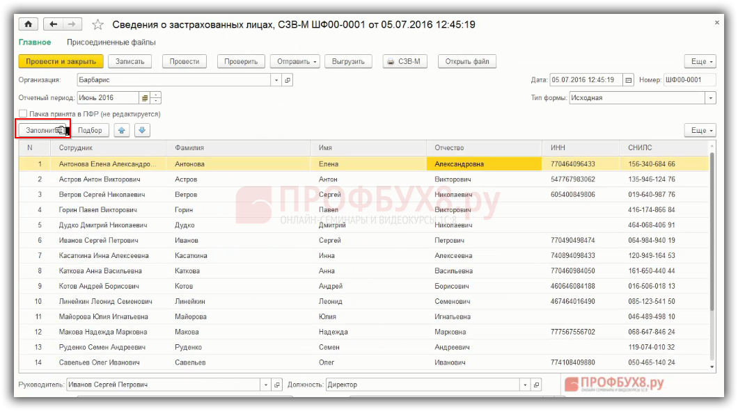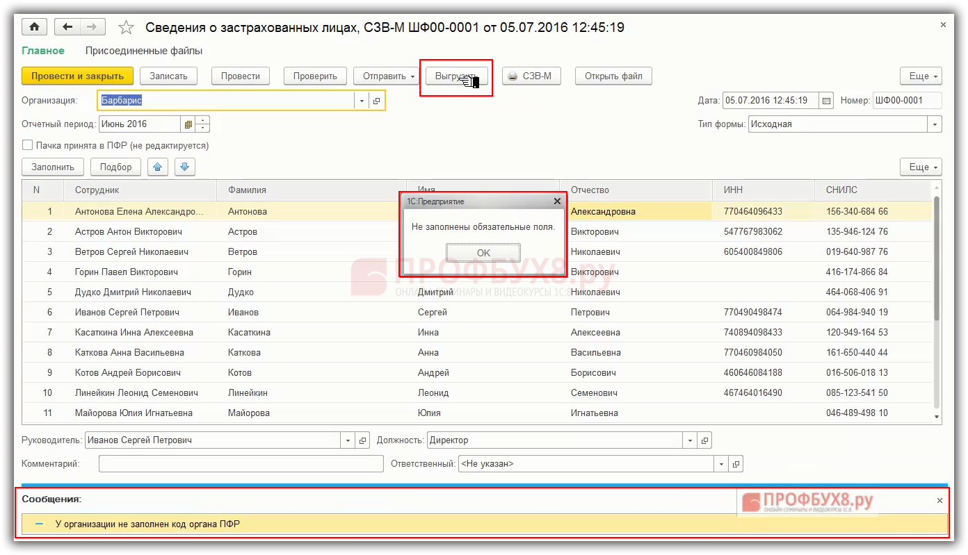 При этом необходимо дозаполнить данные и повторить выгрузку. Тогда файл будет выгружен правильно. После чего можно отправлять в Пенсионный фонд.