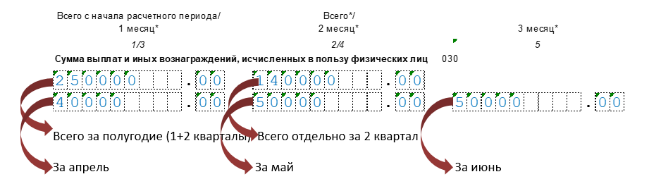 По строке 040 приведите информацию о необлагаемых взносами выплатах в периоде.