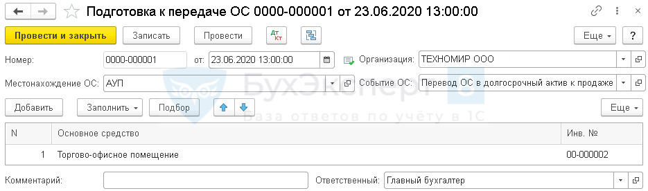 - Субконто — наименование долгосрочного актива к продаже из справочника Номенклатура.