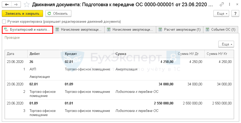 При проведении документа сформируются проводки по начислению амортизации за месяц начала подготовки к реализации объекта и по определению остаточной стоимости.