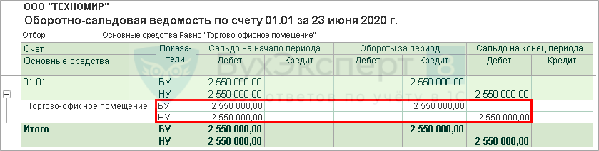 Из отчетов видно, что в БУ актив учитывается уже на счете 41.01 по остаточной стоимости, а в БУ — на счете 01.01.