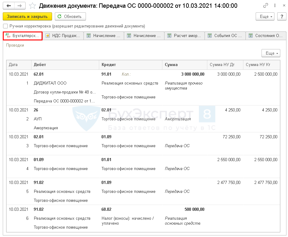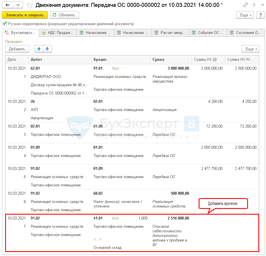 Поскольку долгосрочный актив к продаже по-разному учитывается в БУ и НУ, и сформированные проводки не совсем удовлетворяют его учету, отредактируйте их вручную.