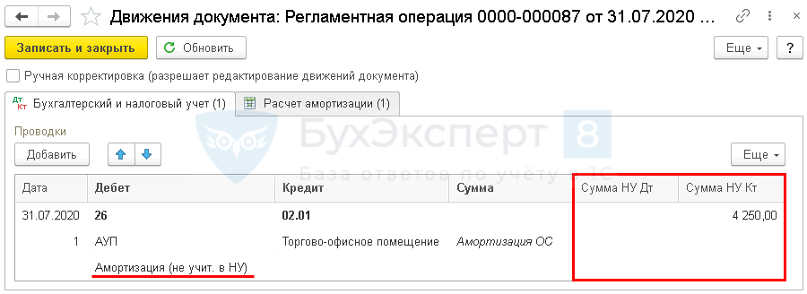 Шаг 1. Установите флажок Ручная корректировка и удалите суммы по НУ: в НУ актив продолжает амортизироваться.