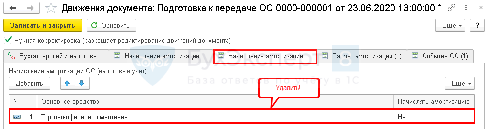 Шаг 2. Перейдите на вкладку Начисление амортизации ОС (налоговый учет) и удалите запись.