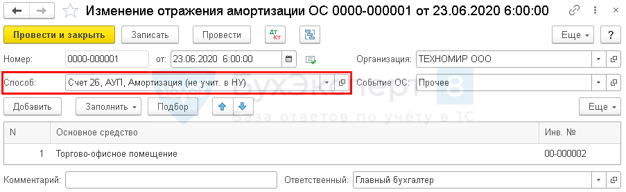 Шаг 4. Затраты на амортизацию долгосрочного актива к продаже в НУ рекомендуется не признавать в расходах, поэтому на дату перевода ОС введите документ Изменение отражения амортизации ОС в разделе ОС и НМА – Параметры амортизации ОС.