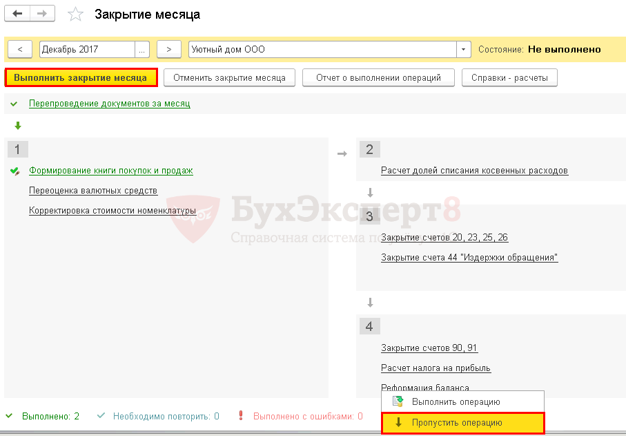 Для определения убытка по налоговому учету необходимо запустить процедуру Закрытие месяца, раздел Операции – Закрытие периода – Закрытие месяца по следующему алгоритму: