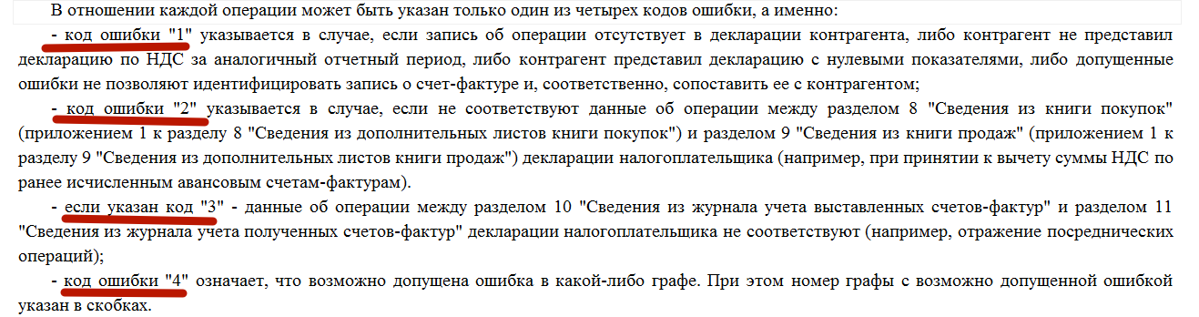 Выясните, по каким из отраженных в декларации операций инспекция обнаружила противоречия (несоответствия). Перечень таких операций должен прилагаться к полученному требованию (Приложение к Письму ФНС России от 06.11.2015 № ЕД-4-15/19395). По каждой записи данного перечня налоговой инспекцией справочно указывается один из четырех кодов возможной ошибки, расшифровка которых приведена в Приложении к Письму ФНС России от 06.11.2015 № ЕД-4-15/19395.