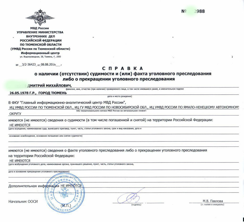 Прописывается номер статьи с классификацией, согласно Уголовного кодекса РФ. В случае отсутствия информации, указывается, что сведений не имеется. Подписывает ее уполномоченное должностное лицо МВД.