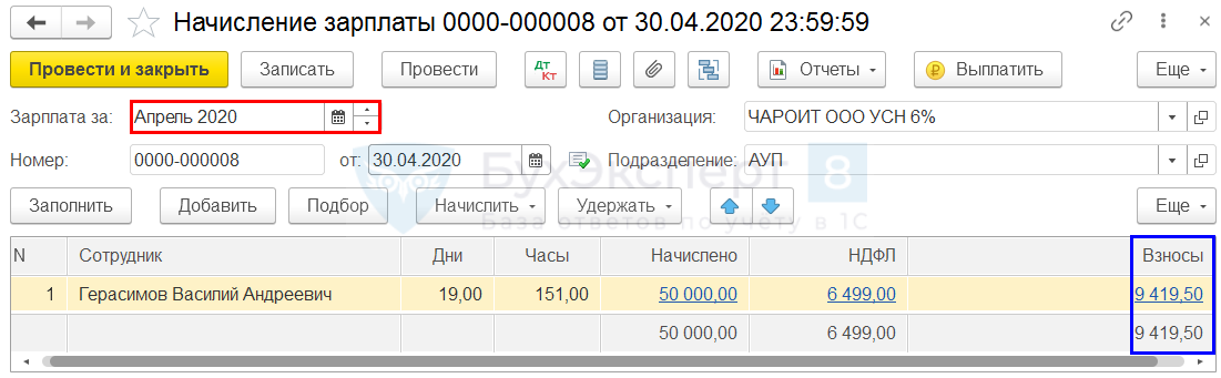 Зарплата и кадры – Все начисления – Начисление зарплаты – Взносы