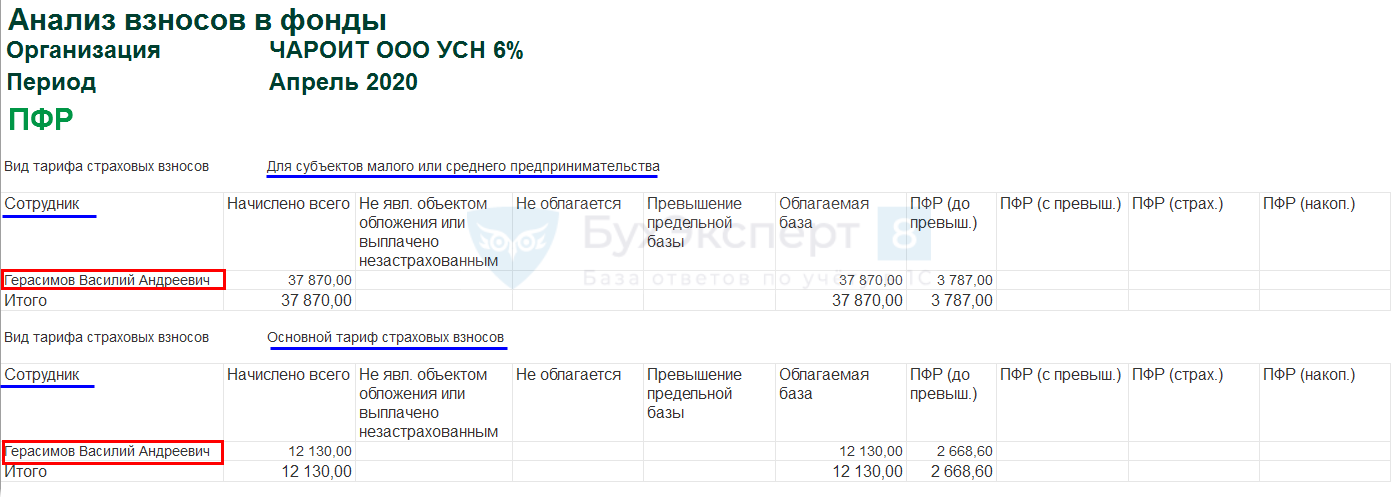 Зарплата и кадры – Отчеты по зарплате – Анализ взносов в фонды – Еще – Прочее – Изменить вариант отчета – Вид тарифа страховых взносов – вместо Начисление выбрать Сотрудник