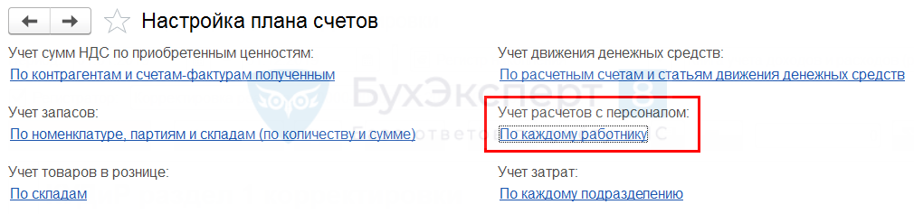 Администрирование – Параметры учета – Настройка плана счетов – Учет расчетов с персоналом: По каждому работнику