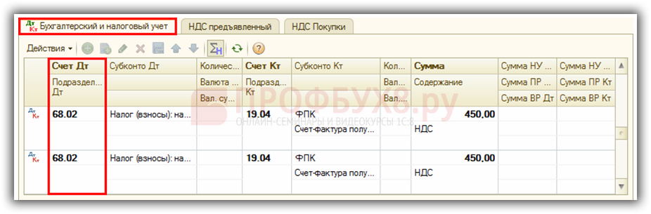 При включении в документ Формирование записей книги покупок записей по принятию «входного» НДС к вычету по операциям поступления товаров (работ, услуг) в 1С 8.2 создаются проводки по дебету счета 68.02: Дт 68.02 Кт 19 – на сумму «входного» НДС, принятого к вычету:
