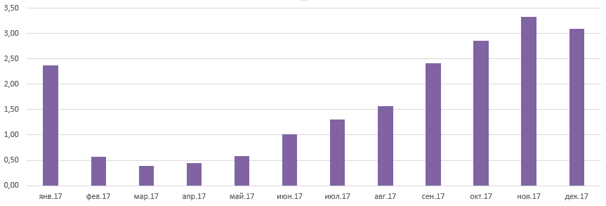 Значение коэффициента менялось в течение года. Минимум был в апреле: 0,4. Это значит, что материальные ценности успели обернуться только на 40%. Максимум наблюдается в ноябре: товарные запасы обернулись более 3 раз.