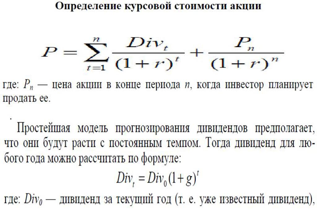 Действительная стоимость акции заключается для инвестора в будущих доходах, поэтому расчет действительной стоимости акции учитывает требуемый уровень прибыльности и распределение предполагаемых доходов в будущем.
