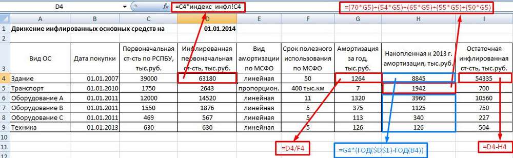 - Для корректировки стоимости основных средств необходимо инфлировать их первоначальную стоимость и пересчитать амортизацию по международным стандартам. Подготовим рабочую таблицу с индексами инфляции для разных периодов (*).