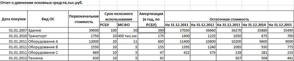 Столбцы «РСБУ» и «МСФО» заполнены с помощью ссылок на соответствующие значения в соответствующих таблицах. Суммы корректировок – разница между оценкой основных средств по МСФО и РСБУ.