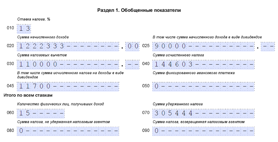 Если строки 020 – 050 заполняют применительно к определенной ставке налога, то строки 060 – 090 по всем ставкам суммарно. В этом случае не имеет значения, сколько первых разделов было заполнено налоговым агентом, поскольку информацию по строкам 060 – 090 приводит один раз на следующей после титульного листа странице расчета.
