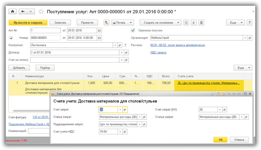 - Колонка «Счета учета» предоставляет возможность задать счет, подразделение и статью затрат. Но только в том случае, если все настройки выполнены корректно.