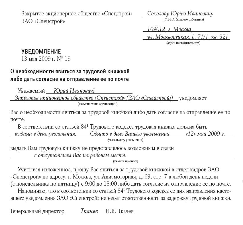 Если же в день истечения срока трудового договора (день увольнения) сотрудник так и не выйдет на работу, то на его домашний адрес придется отправить (по почте заказным письмом) еще одно уведомление — о необходимости явиться в офис за трудовой книжкой или дать согласие на ее отправку по почте. Пересылка трудовой книжки почтой по указанному работником адресу допускается только с его согласи я ст. 84.1 ТК РФ; п. 36 Правил ведения и хранения трудовых книжек. утв. Постановлением Правительства РФ от 16.04.2003 № 225 (далее — Правила) .