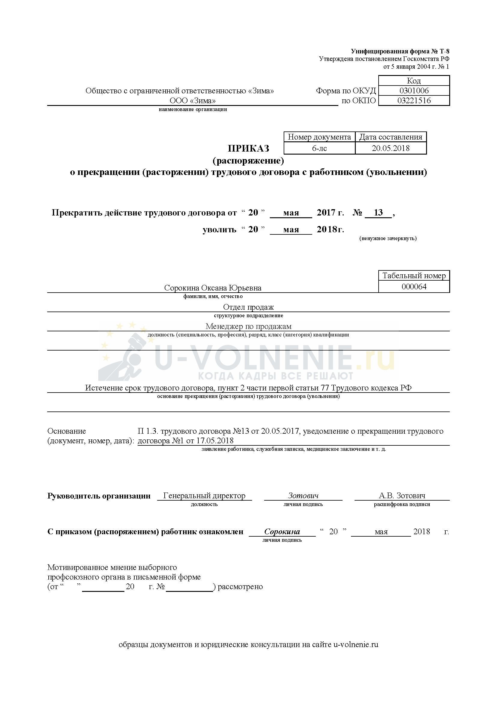 Нужно издать приказ об увольнении временного трудящегося. Составляется он по форме Т-8. Допускается использование собственной формы, если она есть у предприятия. Информация об увольнении вносится в личную карточку трудящегося, трудовую книжку. Необходимое документальное сопровождение прописано в статье 84.1 ТК РФ.