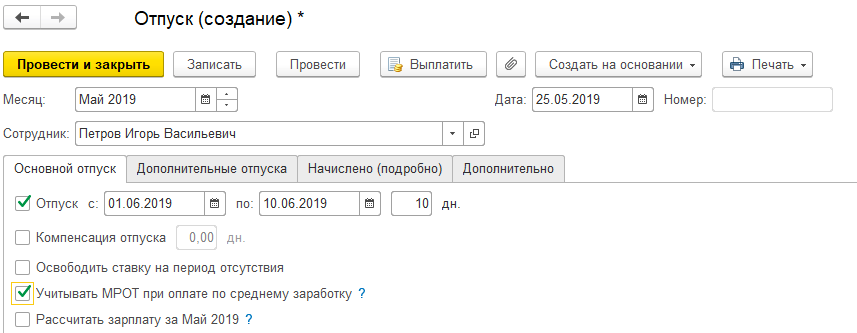 Другими словами, если сотруднику весь расчетный период платится зарплата в размере МРОТ, то при расчете, например, отпуска за весь месяц его сумма окажется ниже, чем текущий МРОТ. Такая ситуация возможно в условиях постоянного изменения размера МРОТ в большую сторону. Чтобы реализовать требования нормативных актов в программе «1С:Зарплата и кадры государственного учреждения 3.1» во все документы с оплатой по общему среднему заработку (отпуск, командировка и т.п.) добавлен флажок «Учитывать МРОТ при оплате по среднему заработку» (Рис. 7).