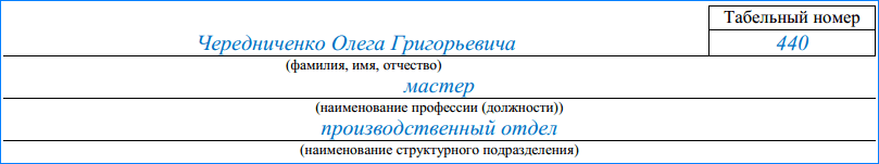Следующим этапом записывают полные Ф.И.О. сотрудника и его табельный номер, название занимаемой им должности. Если работник приписан к конкретному структурному подразделению, его название указывают в соответствующей графе, в противном случае там проставляется прочерк.