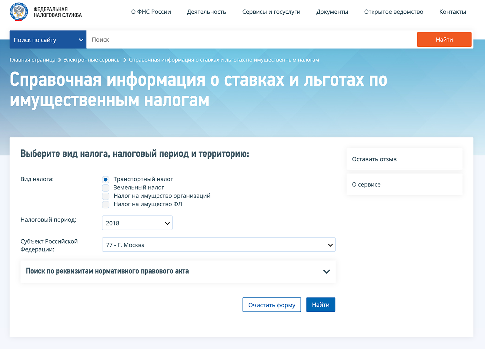 Поиск ставки налога на сайте налоговой. Необходимо выбрать вид налога, налоговый период и субъект, в котором зарегистрировано транспортное средство