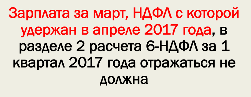Как видно из таблицы, с зарплаты за март, выплаченной в апреле 2017 году, крайний срок уплаты НДФЛ – следующий день после даты удержания налога. Следовательно, если мартовская зарплата выплачена, например, 10 апреля, то НДФЛ нужно внести в бюджет не позднее 11 апреля 2017 года. 11 апреля – это уже первое полугодие. В связи с этим, мартовскую зарплату в разделе 2 расчета за 1 квартал 2017 года показывать вообще не нужно.