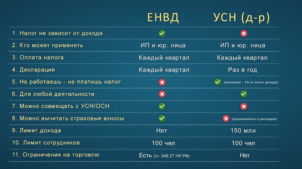 Более подробное сравнение ЕНВД и УСН (д-р) смотрите в таблице ниже.