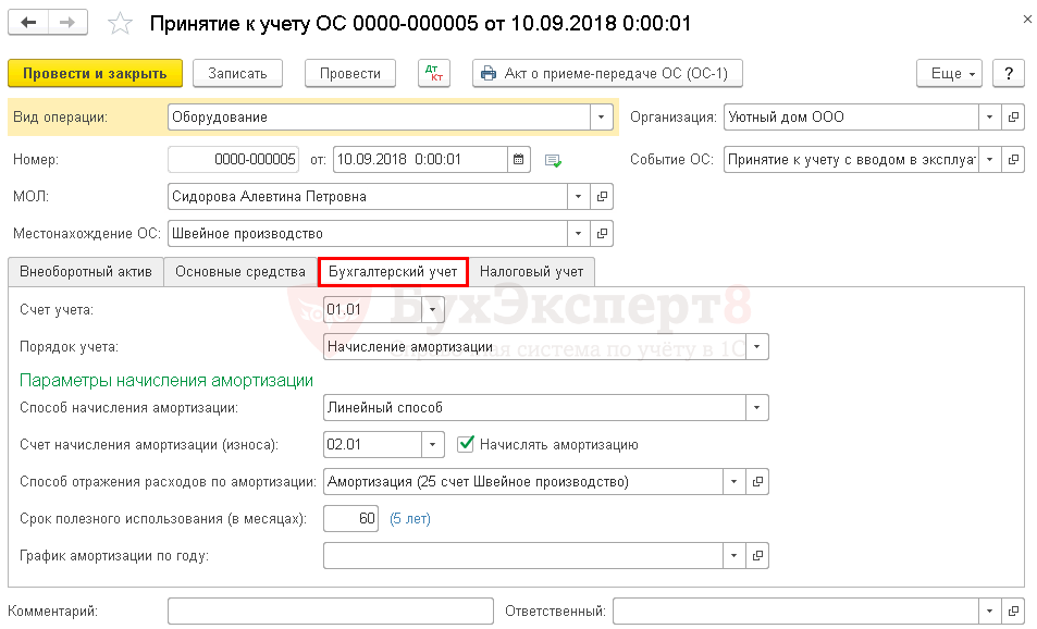 - Счет учета – счет учета вводимого в эксплуатацию ОС;