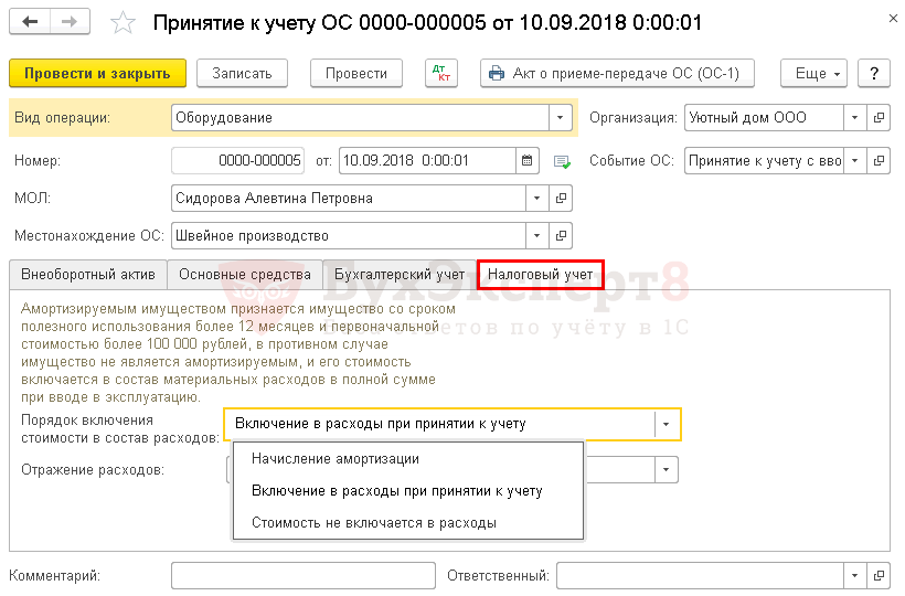 На вкладке Налоговый учет необходимо выбрать Порядок включения стоимости в состав расходов.