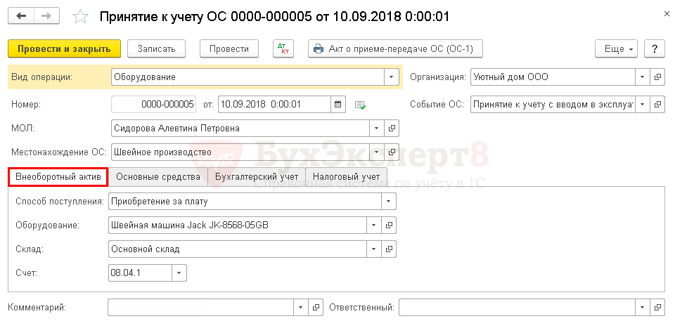 - Оборудование – внеоборотный актив, вводимый в эксплуатацию. Выбирается из справочника Номенклатура;