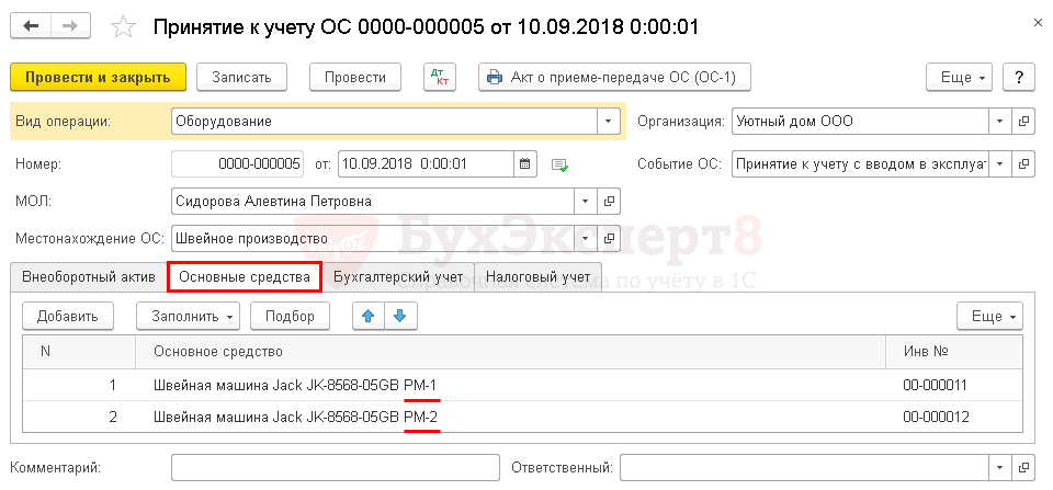 В документе можно ввести в эксплуатацию несколько объектов ОС. Одинаковые позиции основных средств необходимо добавлять в справочник Основные средства отдельными позициями и разграничивать их по определенным признакам, например, по рабочим местам (РМ).