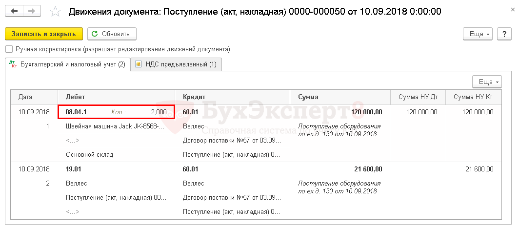 Счет учета заполняется в документе автоматически в зависимости от настроек в регистре Счета учета номенклатуры. Для вида номенклатуры Оборудование (объекты основных средств) по умолчанию установлен счет 08.04.1 «Приобретение компонентов основных средств», но его можно в документе поменять вручную. PDF