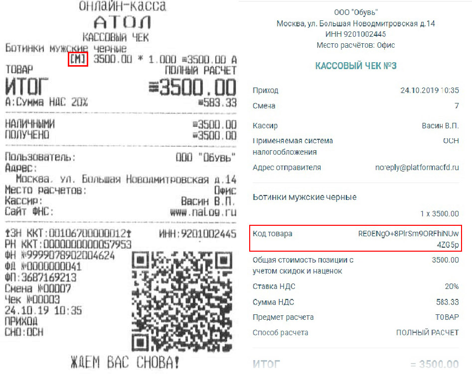 В бумажном чеке отображается признак маркировки, в электронном чеке отображается код идентификации товара.